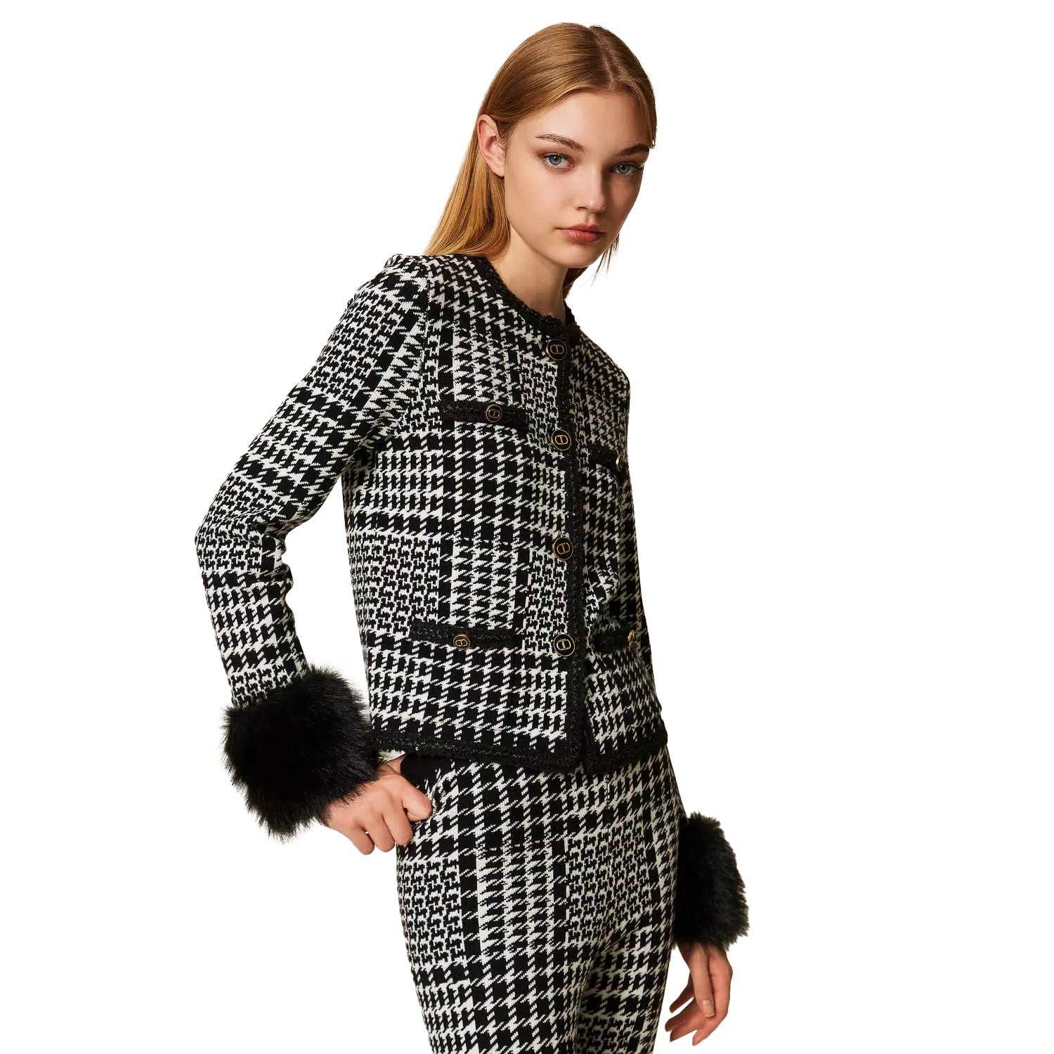Blazer van het merk TwinSet. Blazer van TwinSet met knoopsluiting en afneembare bontjes aan de mouwen. Materiaal: 43% Viscose, 42% Polyamide, 15% Wol.