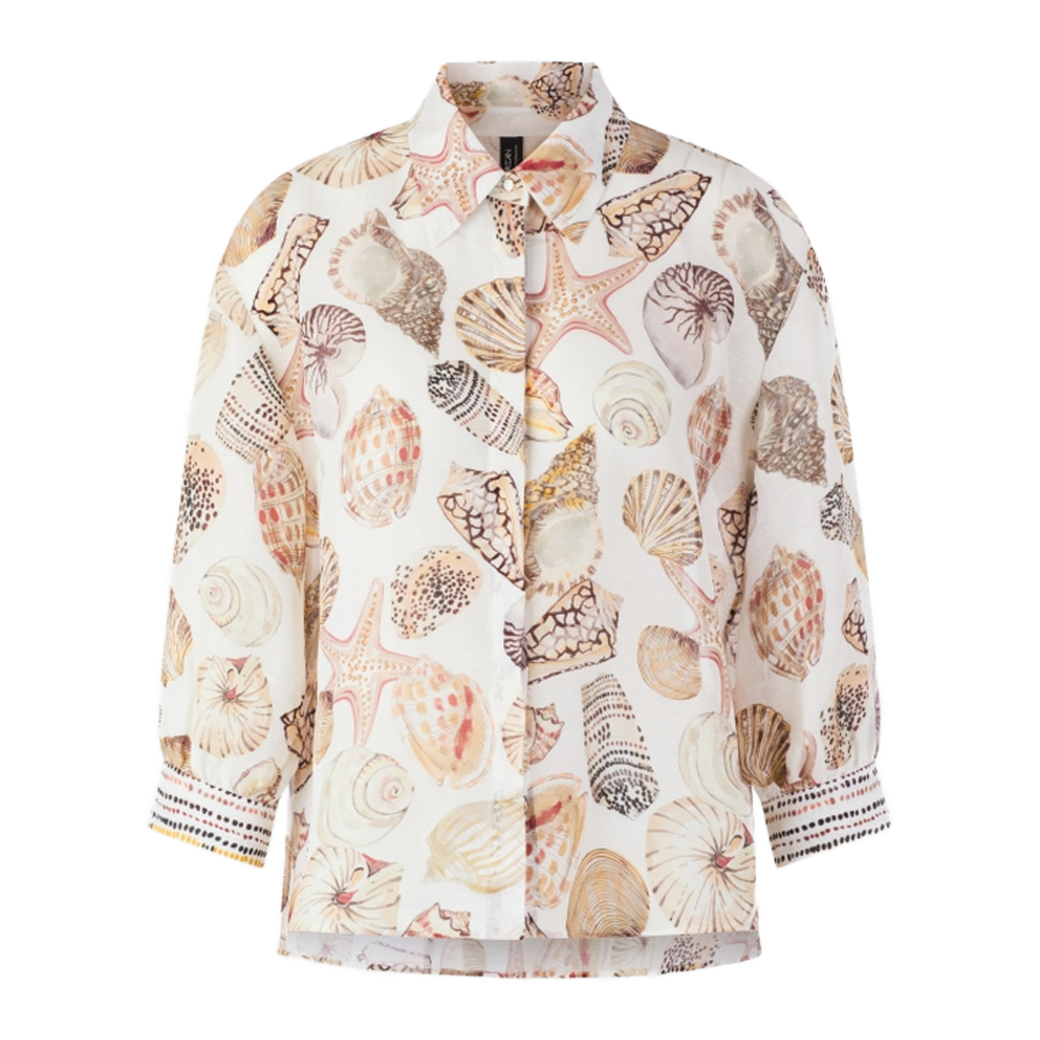 Blouse van het merk Marc Cain Collections. Blouse van Marc Cain Collections met een chique linnen-zijdemix combineert natuurlijk draagcomfort met vrouwelijke elegantie. De stijlvolle schelpenprint, een verborgen knoopsluiting en fijne sierknopen aan de manchetten zorgen voor hoogwaardige accenten. Materiaal: 55% linnen, 45% zijde