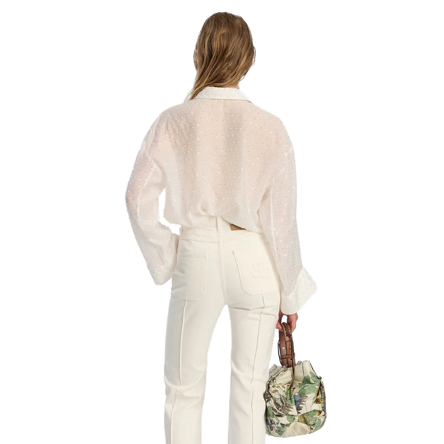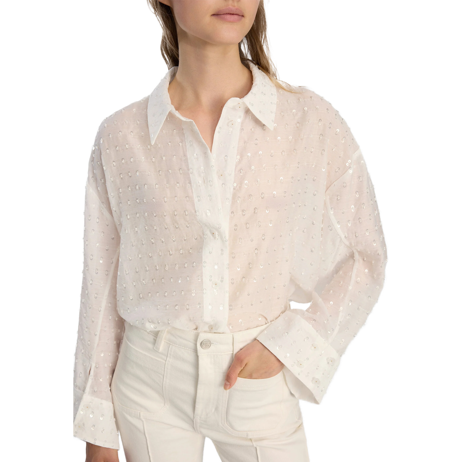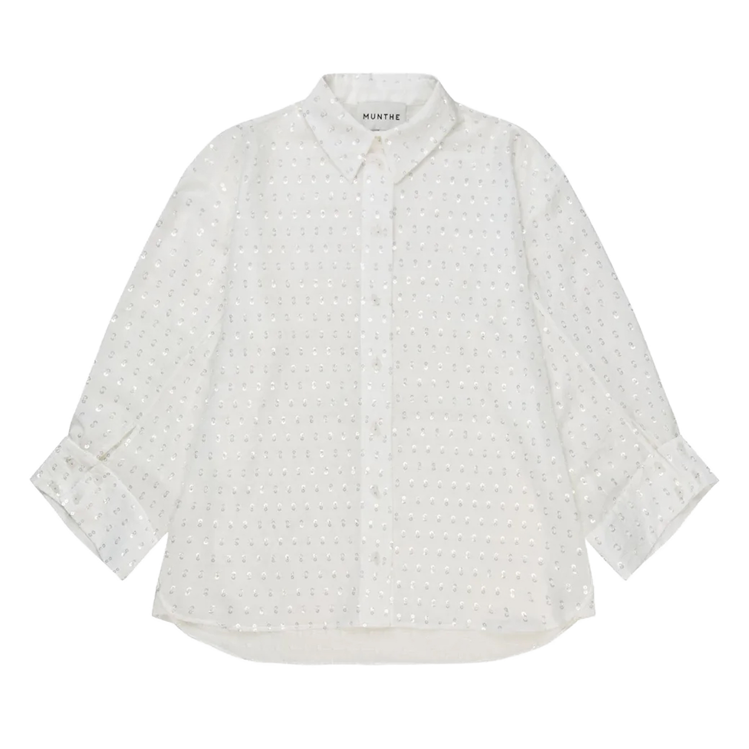 Blouse van het merk Munthe. Blouse van Munthe met een oversized pasvorm en subtiele pailletten. Het is ontworpen met een klassieke kraag, knoopsluiting aan de voorkant en lange mouwen met brede manchetten. Materiaal: 100% Polyester