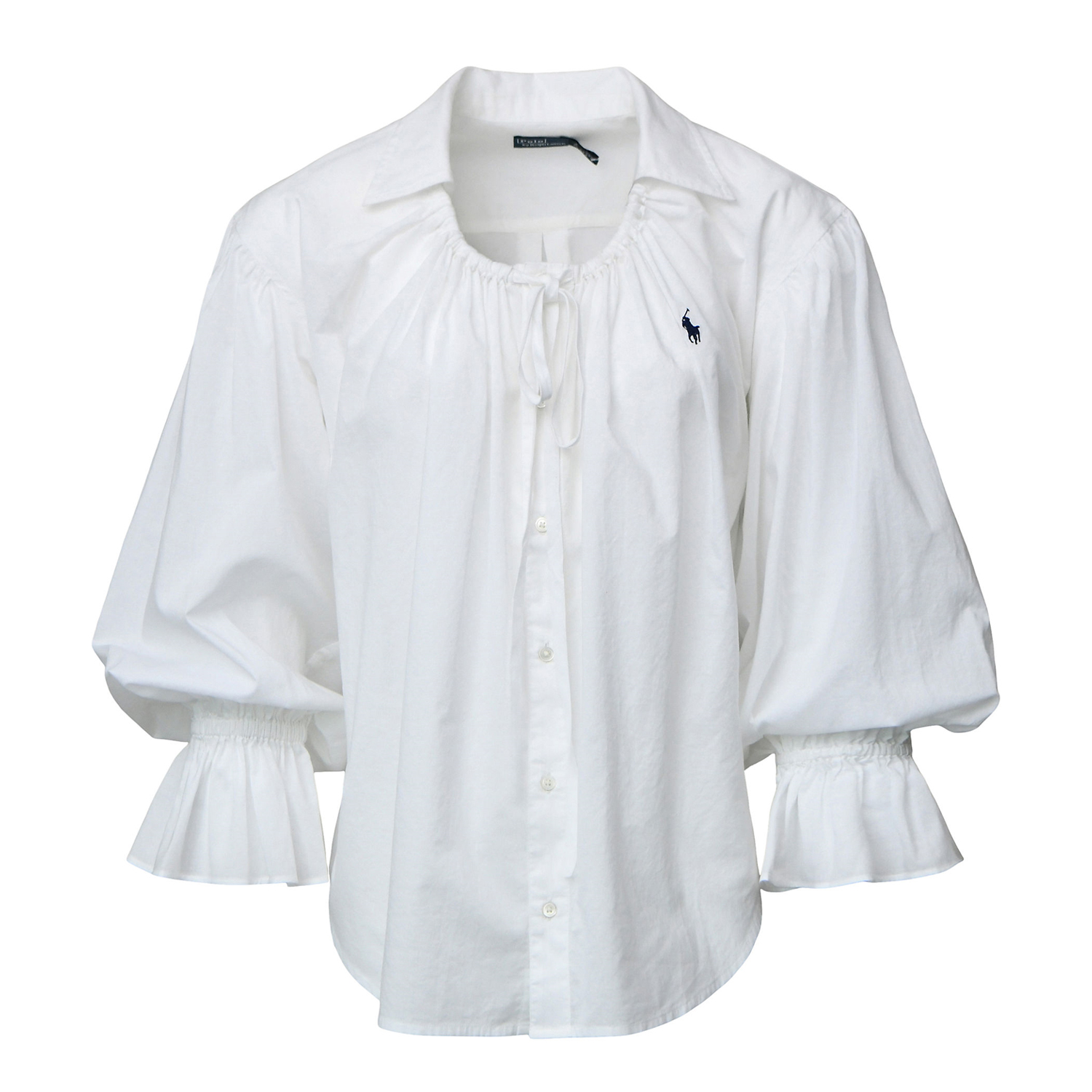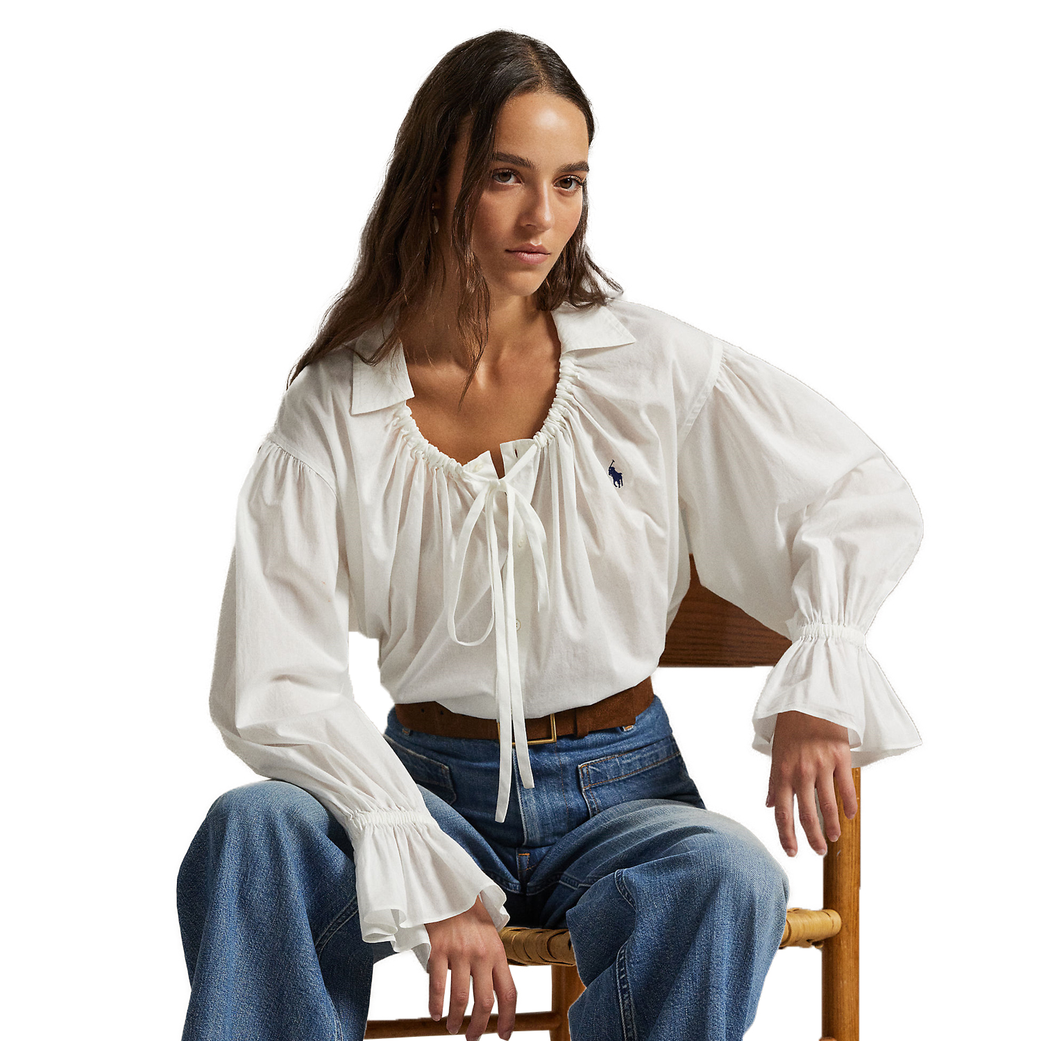 Blouse van het merk Ralph Lauren. Blouse van Ralph Lauren dat zo is geweven dat het glad aanvoelt en een vloeiende vorm heeft. Dit wordt versterkt door delicaat plooien, gerimpelde mouwboorden en tunnelstrikjes bij de halslijn. Materiaal: 100% Katoen