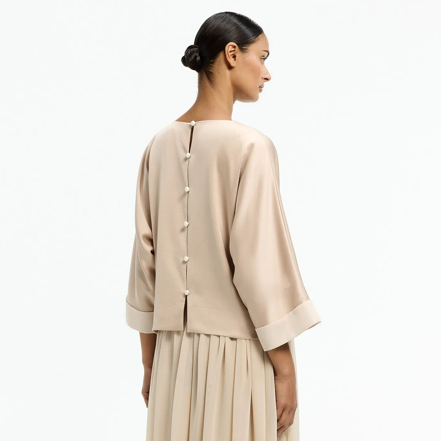 Blouse van het merk Xandres. Blouse van Xandres met parel details aan de achterzijde en wij uitlopende mouwen. Materiaal: 59% Gerecycleerde Polyester, 41% Polyester