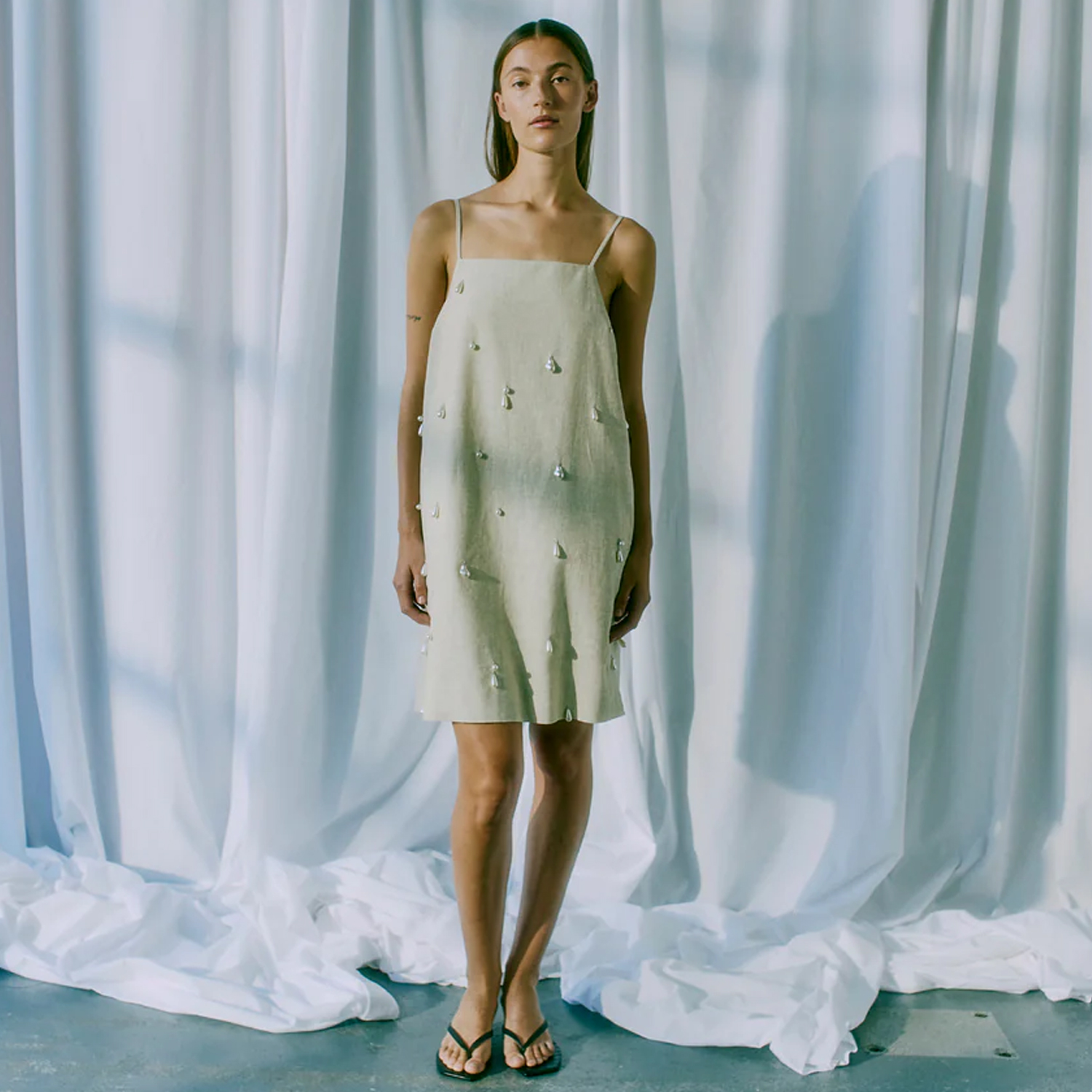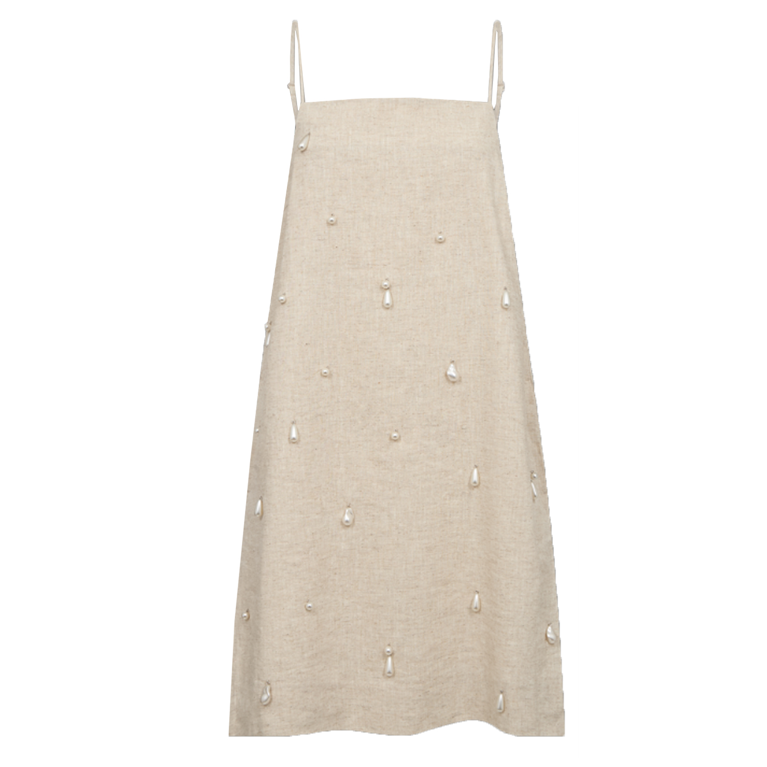 Japon van het merk Copenhagen Muse. Japon van Copenhagen Muse met korte A-lijn silhouet wordt gekenmerkt door een strakke, rechte halslijn en smalle, verstelbare bandjes, terwijl subtiele plooien zorgen voor een perfecte pasvorm. Verspreide druppelvormige parelversieringen creëren een elegante, sculpturale dimensie tegen de textuur van de basisstof. Buitenstof: 80% linnen, 20% katoen. Voering: 100% katoen