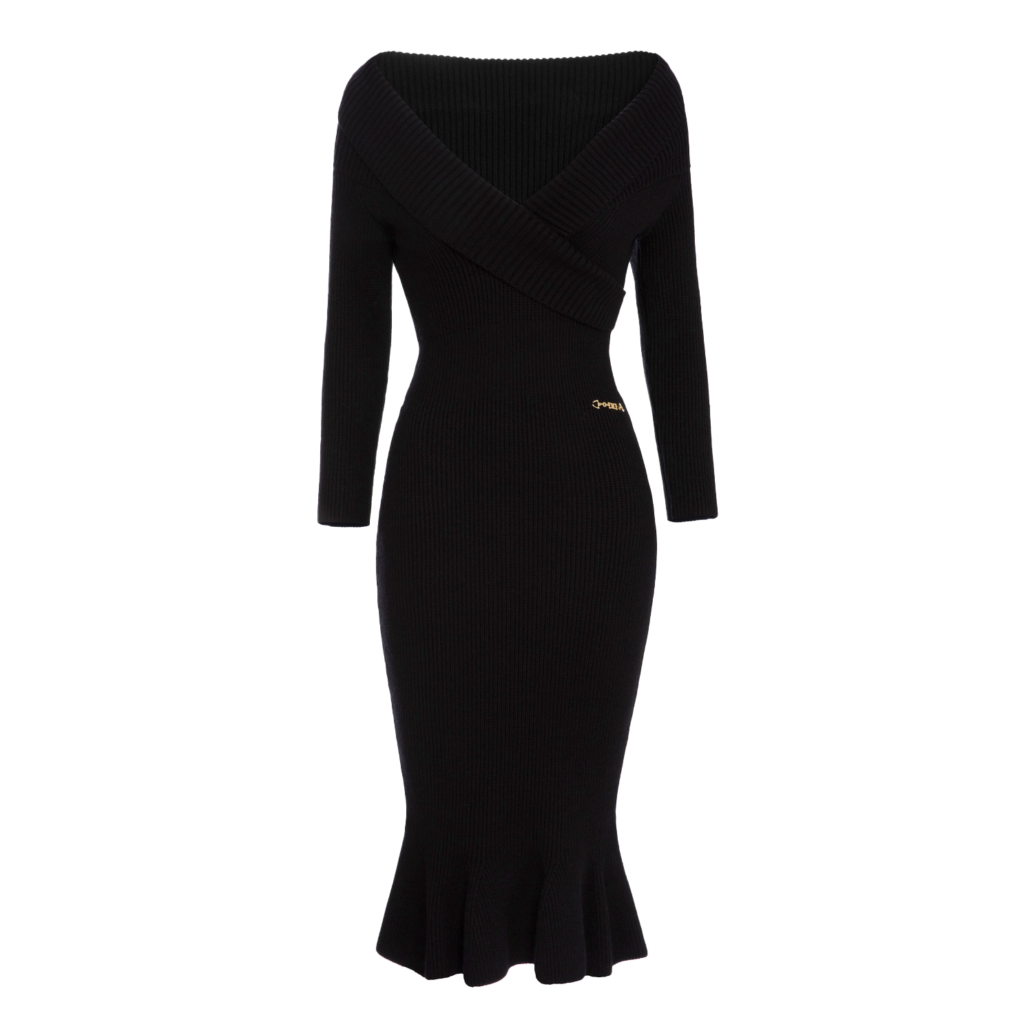 Gebreide jurk met wijd uitlopende rok van het merk Elisabetta Franchi. Ribgebreide jurk van Elisabetta Franchi met kokerrok, driekwart mouwen en diepe hartvormige boothals. De taille wordt geaccentueerd door een band met detail van verguld metaal en loopt over in een wijd uitlopende rok. Materiaal: 46% Viscose 31% Polyamide 23% Polyester