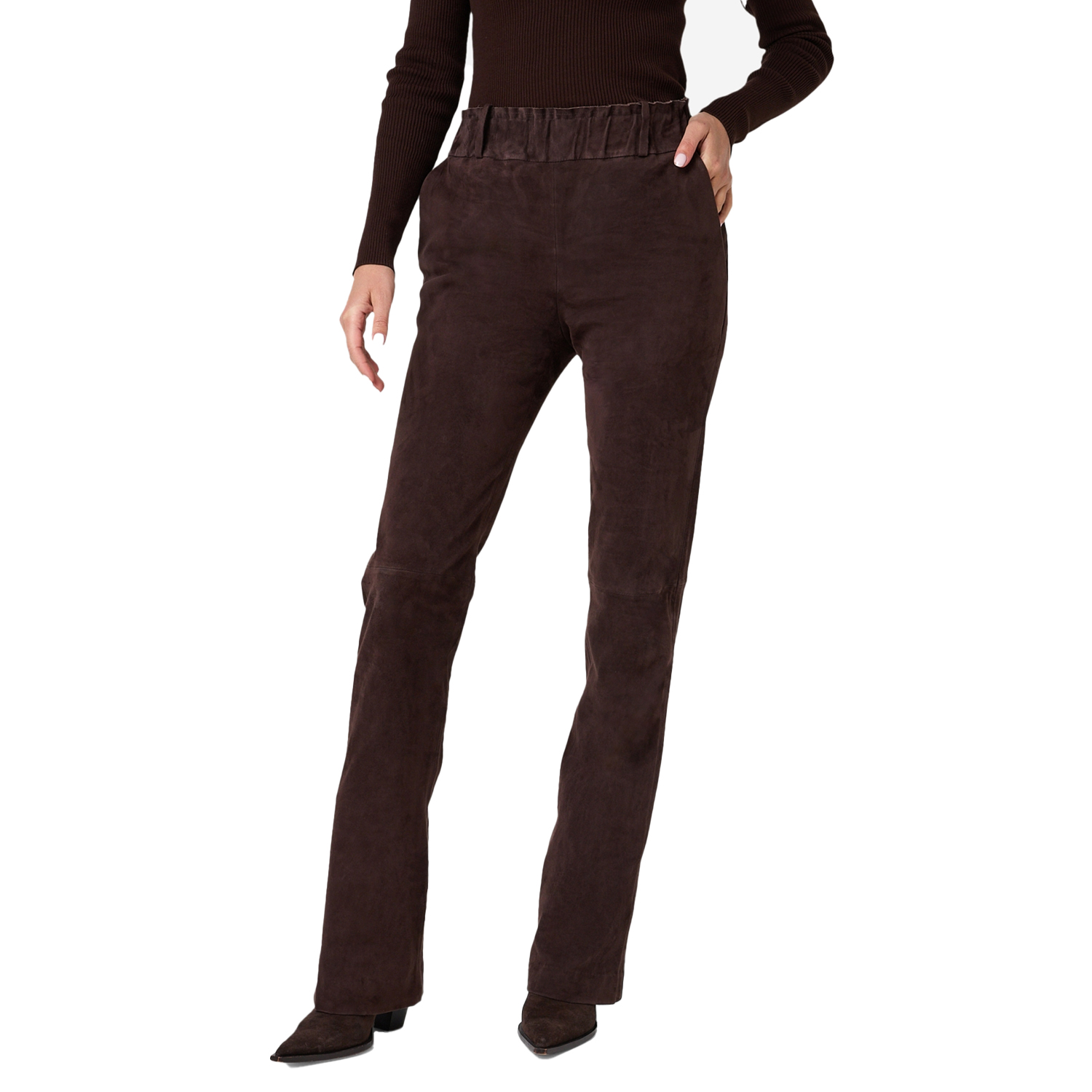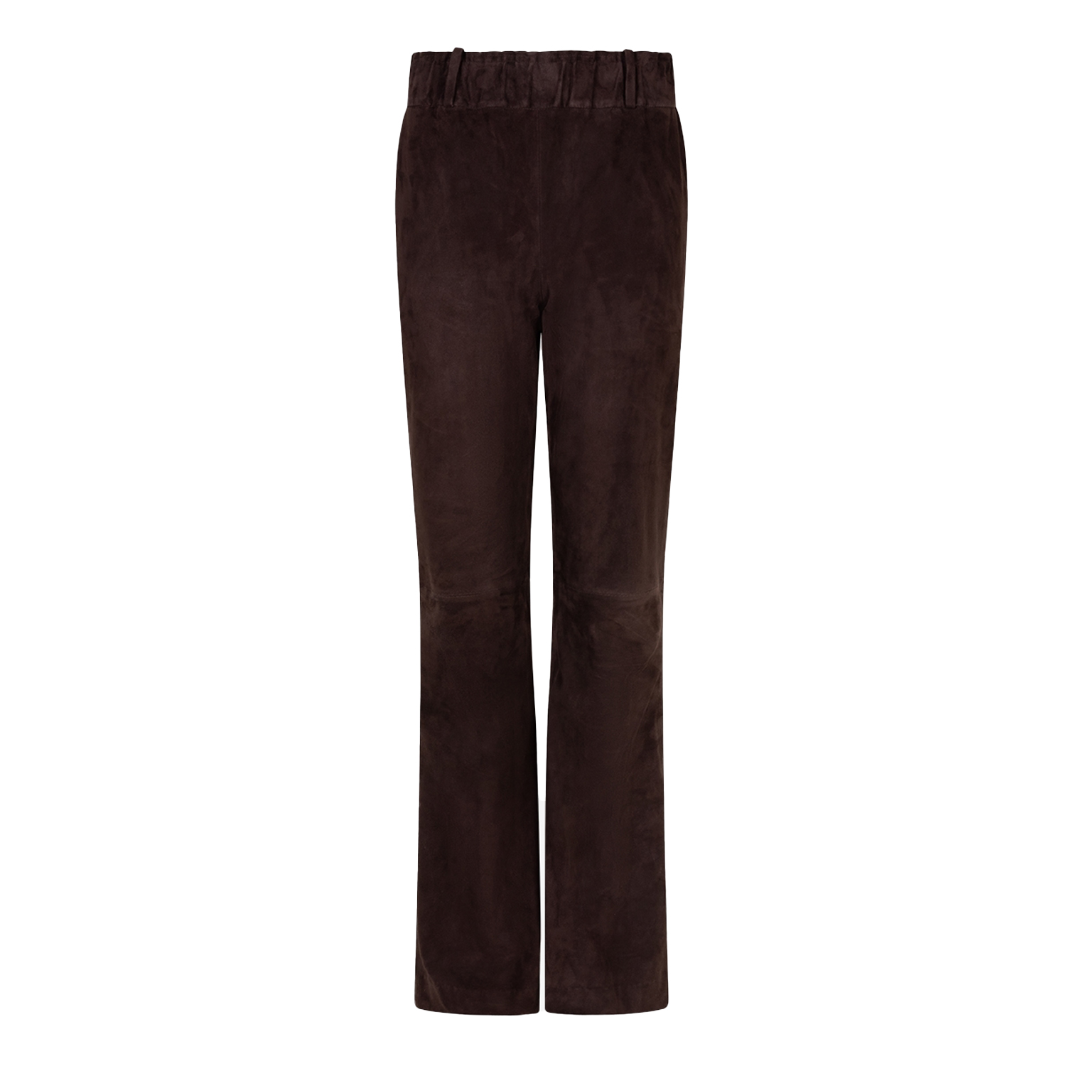 Suede broek van het merk Ibana, model Piena. De Pienna Suede in Coffee Bean is gemaakt van hoogwaardig leer en heeft een aansluitende fit die elegantie en comfort combineert. De broekspijpen lopen licht uit in een subtiele flared, wat zorgt voor een vrouwelijke en flatterende uitstraling. Twee steekzakken en een elastische tailleband maken het ontwerp zowel stijlvol als praktisch. Materiaal: 100% suède