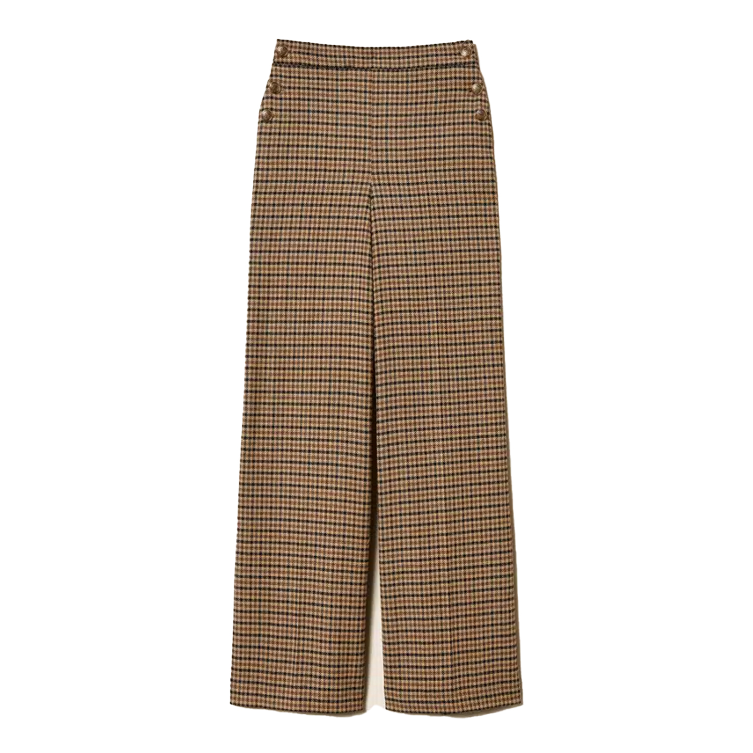 Pantalon van het merk Twinset. Pantalon van Twinset met chique knoopdetails aan de voorzijde en wijd uitlopende broekspijpen. Materiaal: 39% Wol, 30% Polyester, 30% Viscose, 1% Elastane