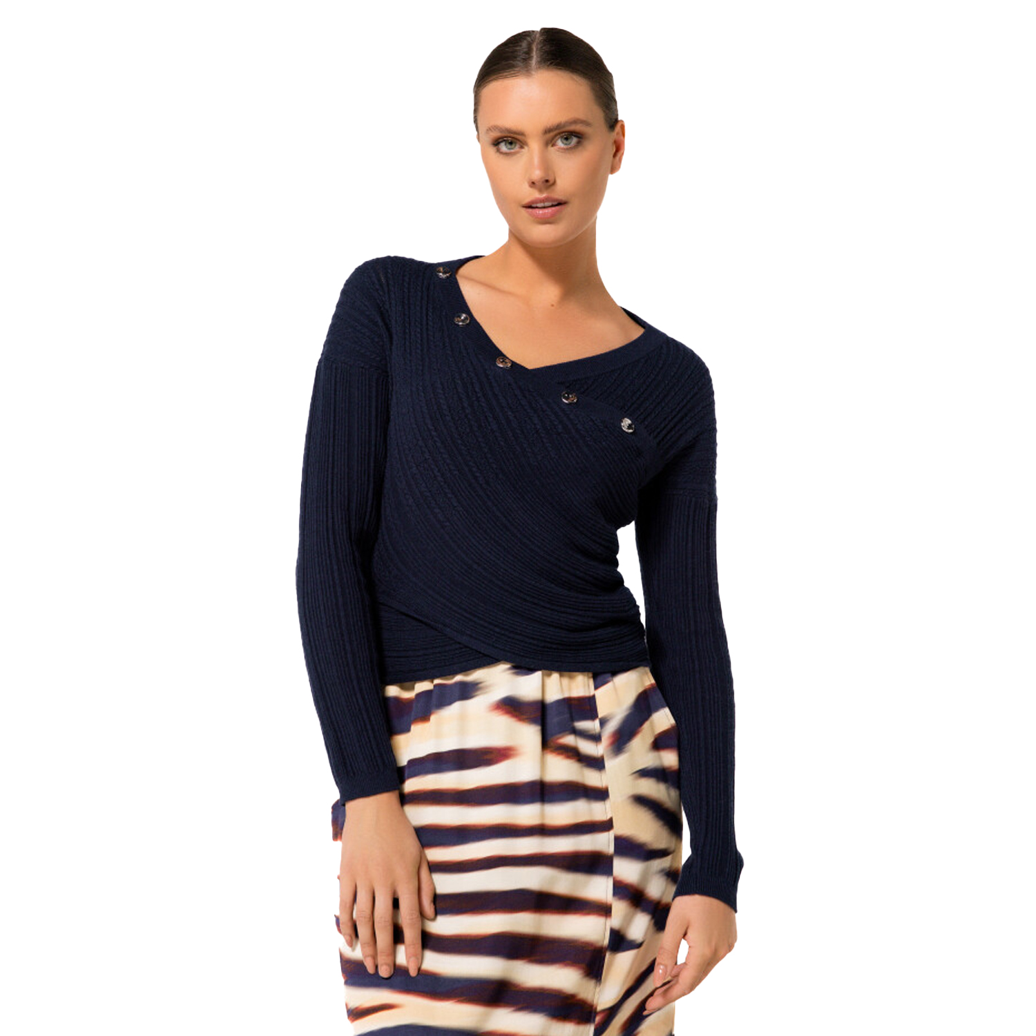 Pullover van het merk Caroline Biss. Pullover van Caroline Biss met v-hals met knoopdetail. Materiaal: 47% viscose 35% polyamide 15% katoen 3% kasjmier
