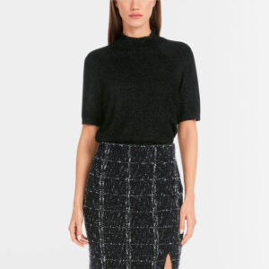 Pullover met korte mouwen van het merk Marc Cain Glam. De trui heeft een los silhouet en voelt pluizig en zacht aan. Materiaal: 44% polyamide, 42% viscose, 14% metaal