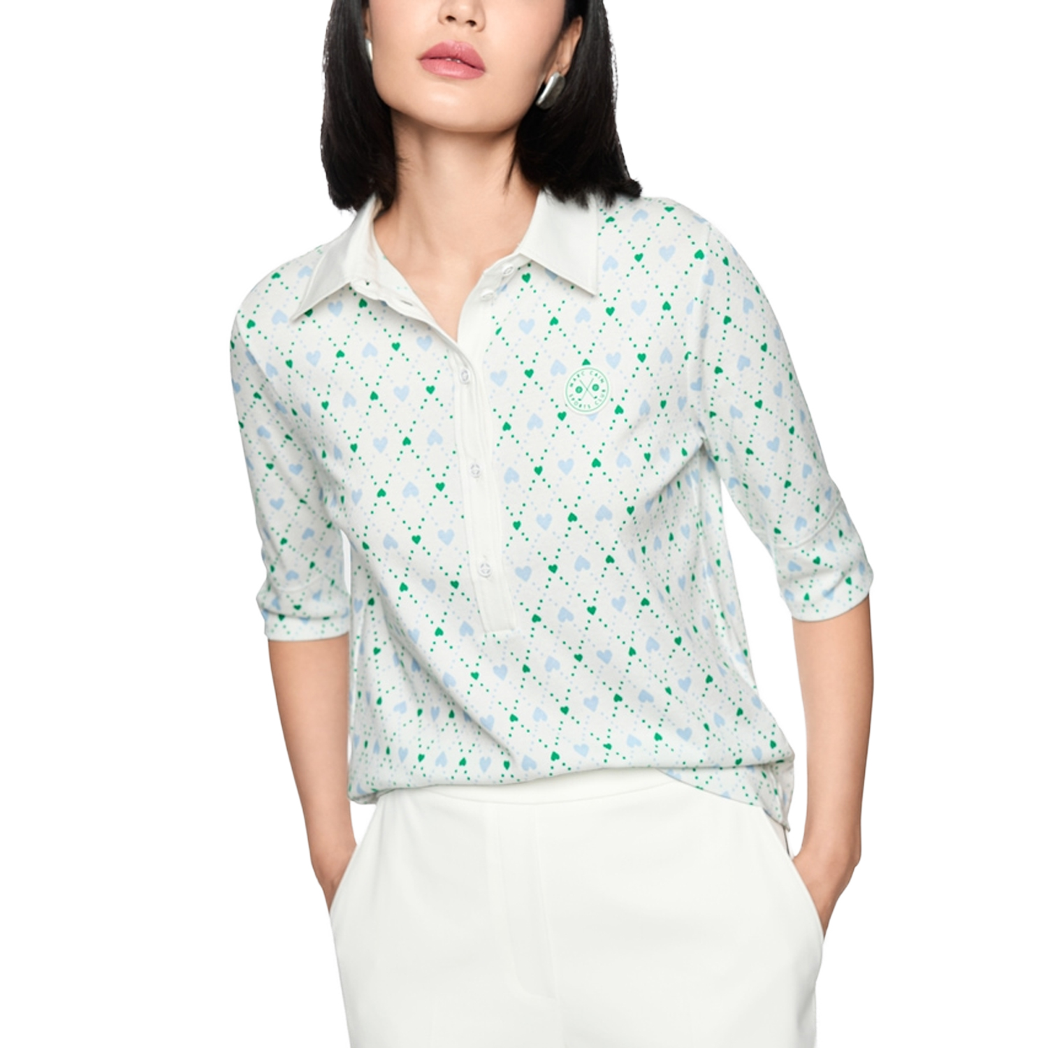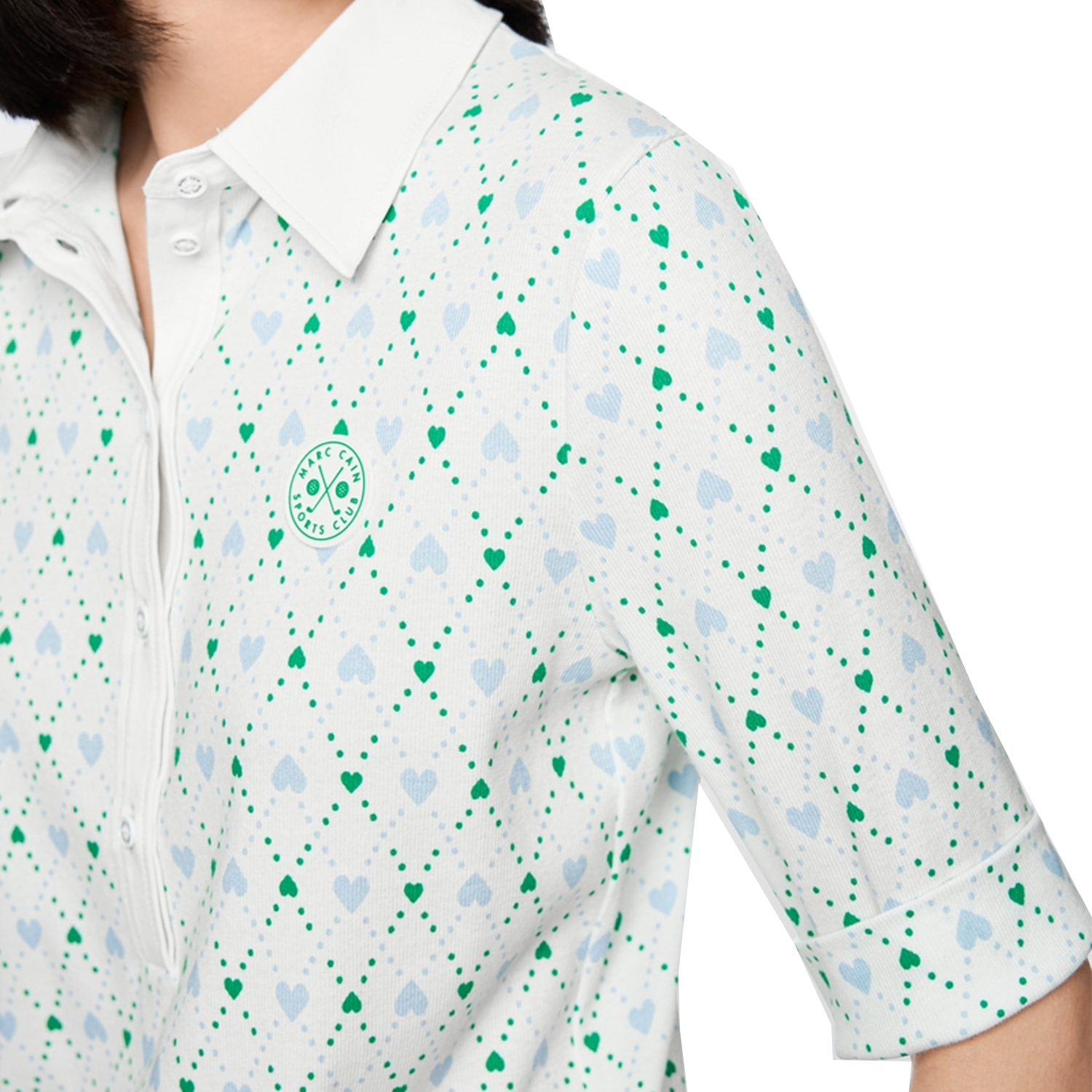 Pullover van het merk Marc Cain Sports. Pullover van Marc Cain Sports met halflange mouwen, kraag en klassieke knoopsluiting. De speelse hartjesprint zorgt voor vrouwelijke accenten, terwijl de losse pasvorm zorgt voor aangenaam draagcomfort. Materiaal: 94% katoen (biologisch), 6% elastaan