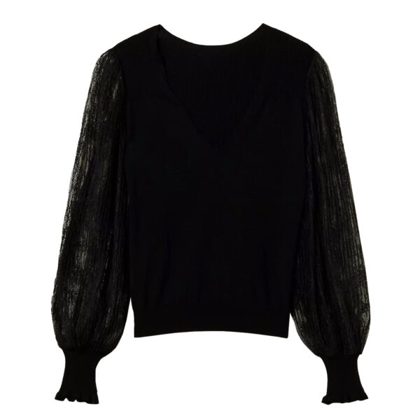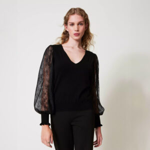 Trui van het merk Twin Set. Trui van Twin Set van gebreide viscosemix met stretch voor kan aan beide kanten gedragen worden. V-hals aan de ene kant en ronde hals aan de andere kant, brede kanten mouwen die bij de armsgaten zijn geplooid met gebreide manchetten, losse pasvorm. Materiaal: 70% viscose 30% polyester. Materiaal 2: 100% polyester