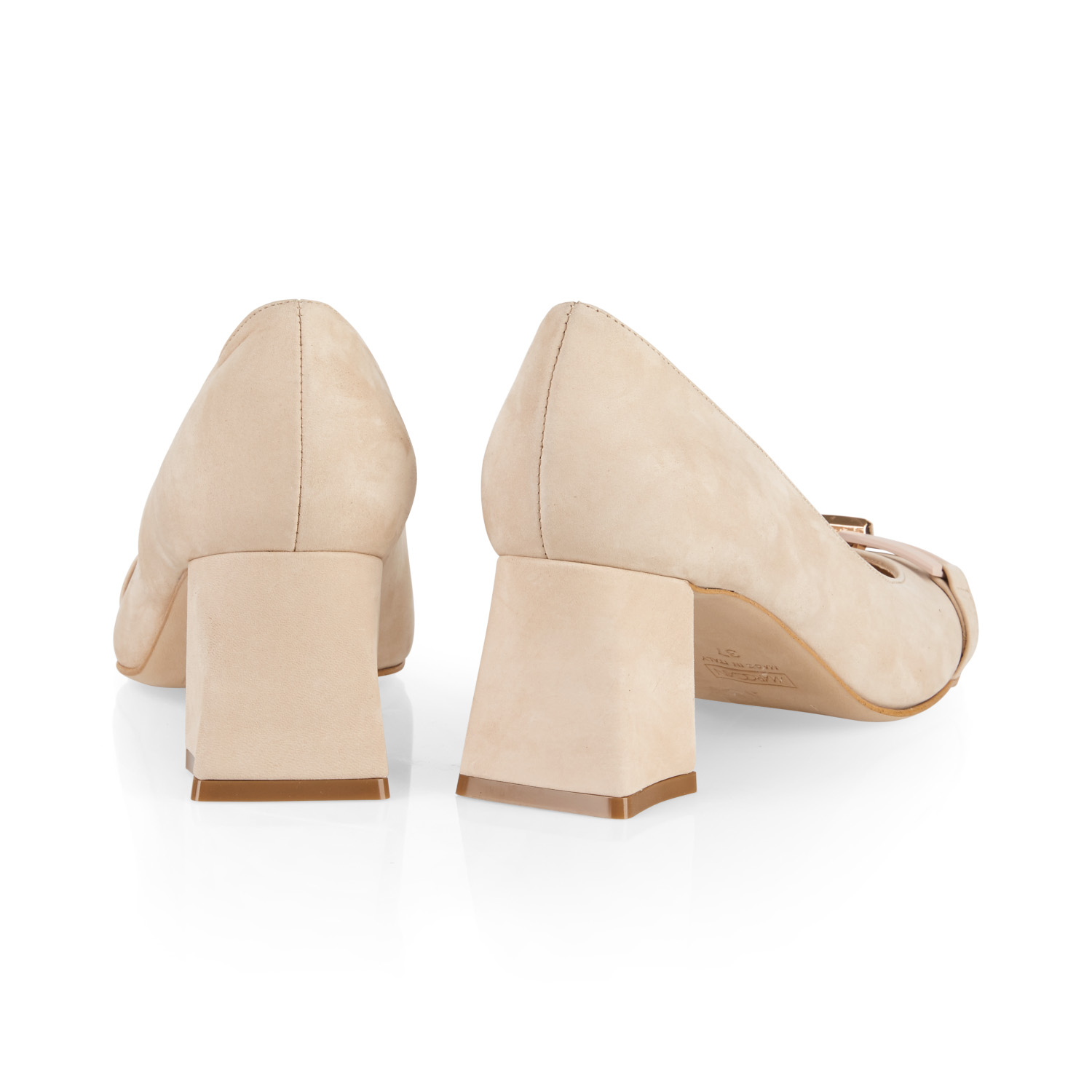 Pumps van het merk Marc Cain. Pump van kalfsnubuck met kettingdetail op een blokhak van 65 mm. Materiaal: 100% leer.