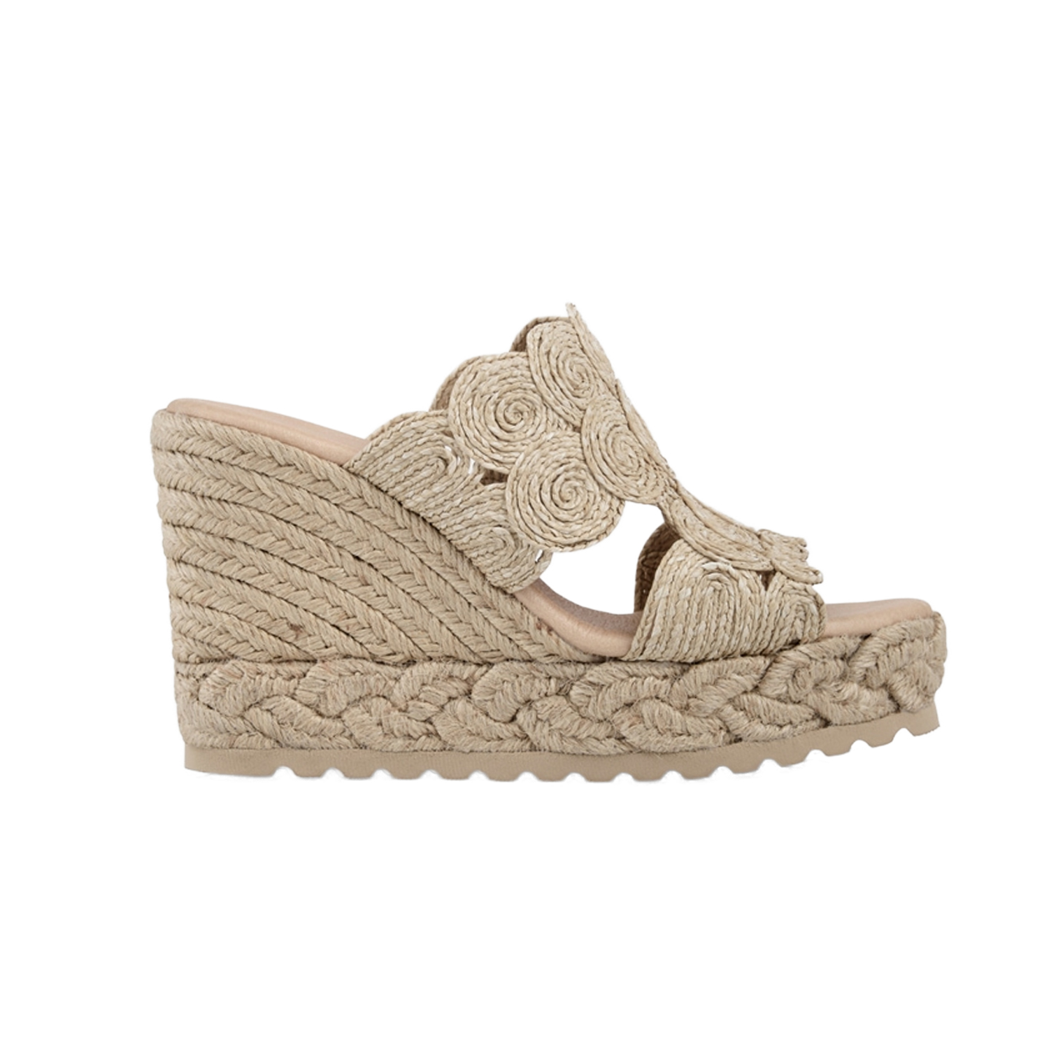 Espadrille van het merk Marc Cain Collections. Zomerse espadrille met elegante sleehak en handgemaakt jute bovenwerk. De hakhoogte van 95 mm zorgt voor een vrouwelijk silhouet, terwijl de antislip rubberen zool zorgt voor een veilige grip
