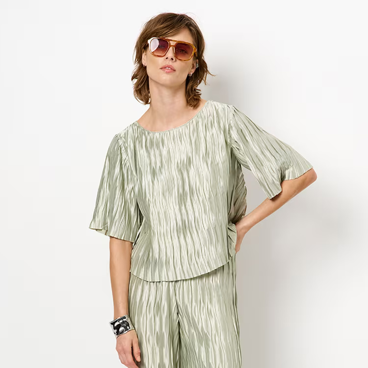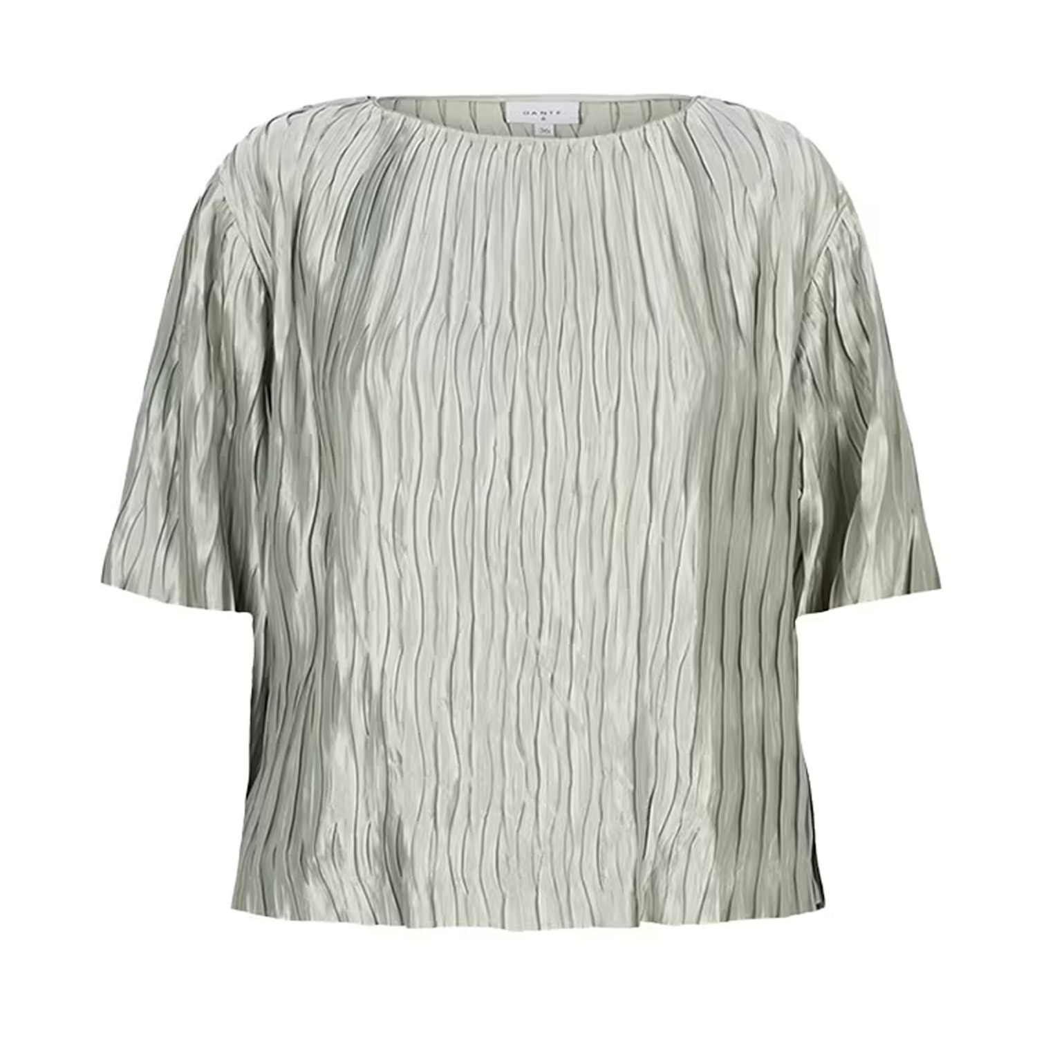Plisse top van het merk Dante6, model Lelia. Top van Dante6 heeft een losse pasvorm, boothals en halflange mouwen. Materiaal: 97% gerecycled polyester, 3% polyester