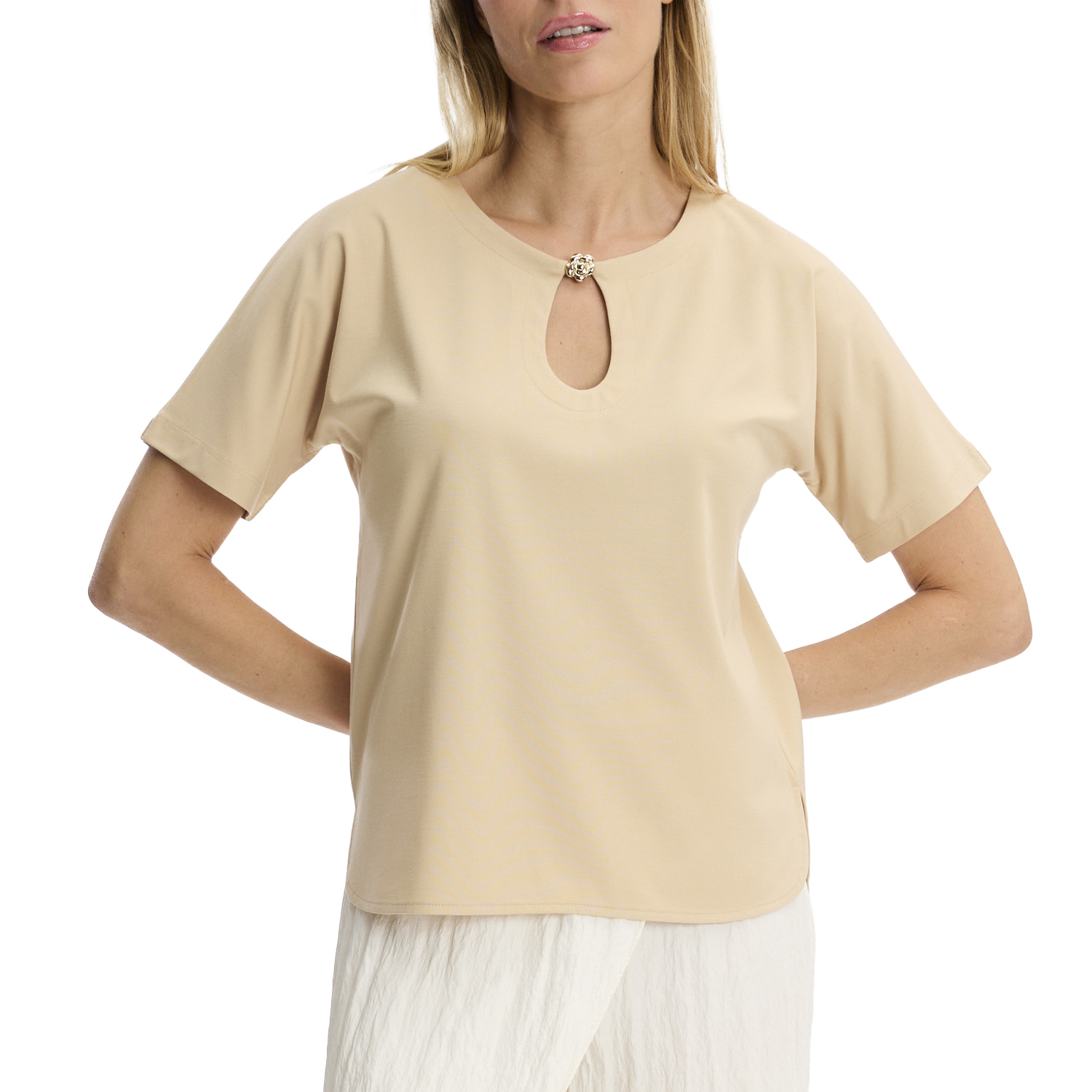 T-shirt van het merk Leo & Ugo. T-shirt van Leo & Ugo met ronde hals en sierlijk gouden bloem detail aan de voorzijde. Materiaal: 63% Viscose, 37% Polyamide