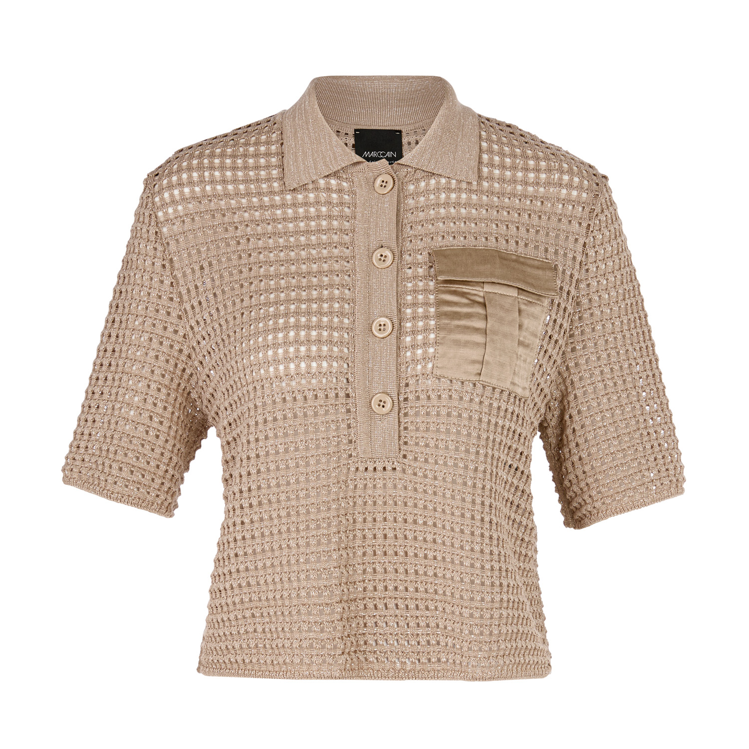 Poloshirt in breisel “Rethink Together’ van het merk Marc Cain Collections. Geweven inzet: 40% viscose, 30% katoen, 30% linnen. Materiaal algemeen: 74% katoen (biologisch), 21% viscose, 5% Polyester,gemetalliseerd
