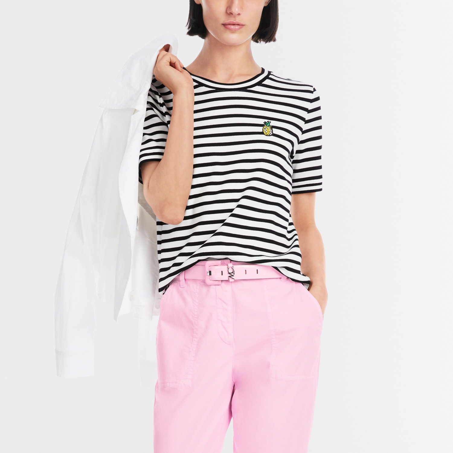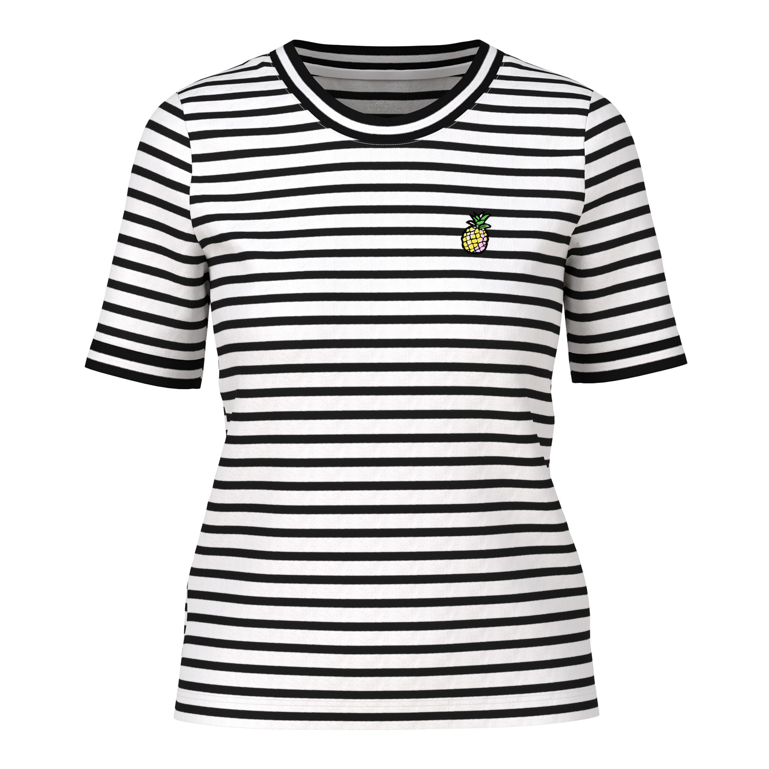 Gestreept geribd T-shirt van het merk Marc Cain Sports. Het T-shirt heeft een vrolijk all-over streepdessin. Opvallend is de ananasapplicatie op de linkerborst. De top heeft een aansluitende pasvorm, een ronde hals en korte mouwen. Materiaal: 94% katoen, 6% elastaan