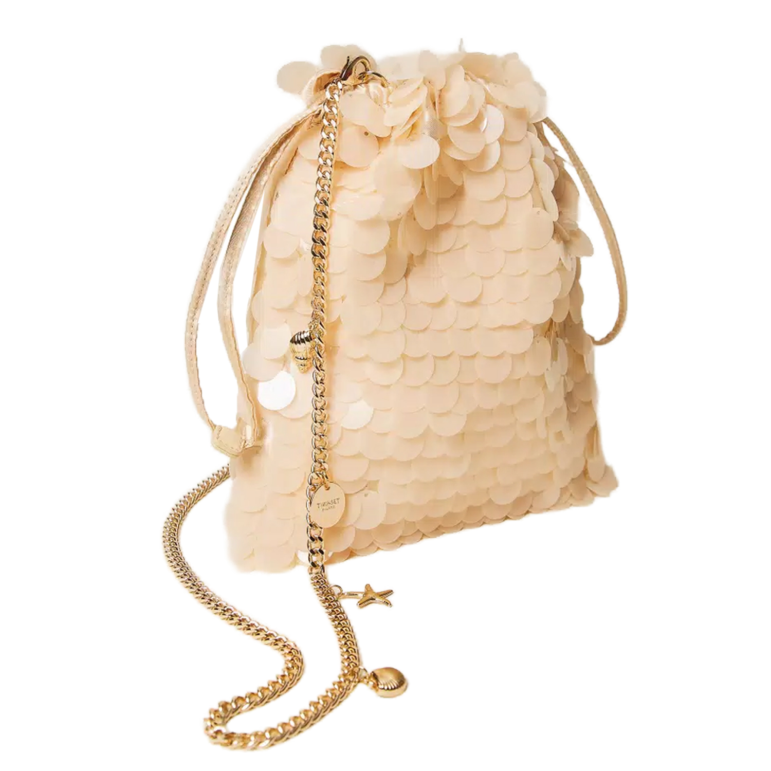 Clutch van het merk TwinSet. Clutch van TwinSet met trekkoord, bekleed met glanzend satijn en afgewerkt met bijpassende maxi-paillettenborduursels. Sluiting met trekkoord, afneembare kettingriem met bedeltjes en logoplaatje
