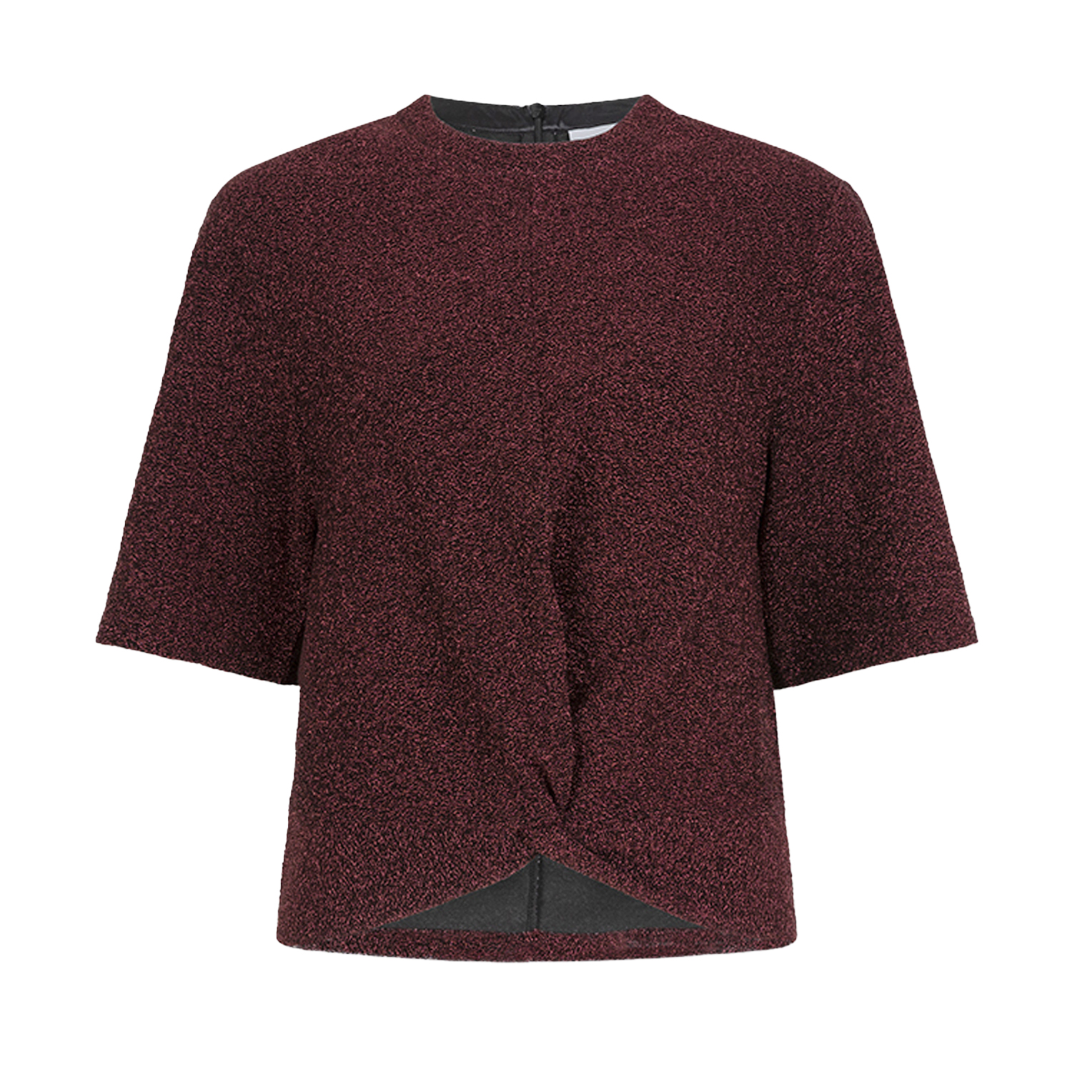 Top van het merk Dante6. Top van Dante6 met zachte lurex jersey met stretch, een hoge halslijn en een speelse twist aan de voorkant. Materiaal: 68% Gerecycled polyamide, 27% Polyester, 5% Elastaan