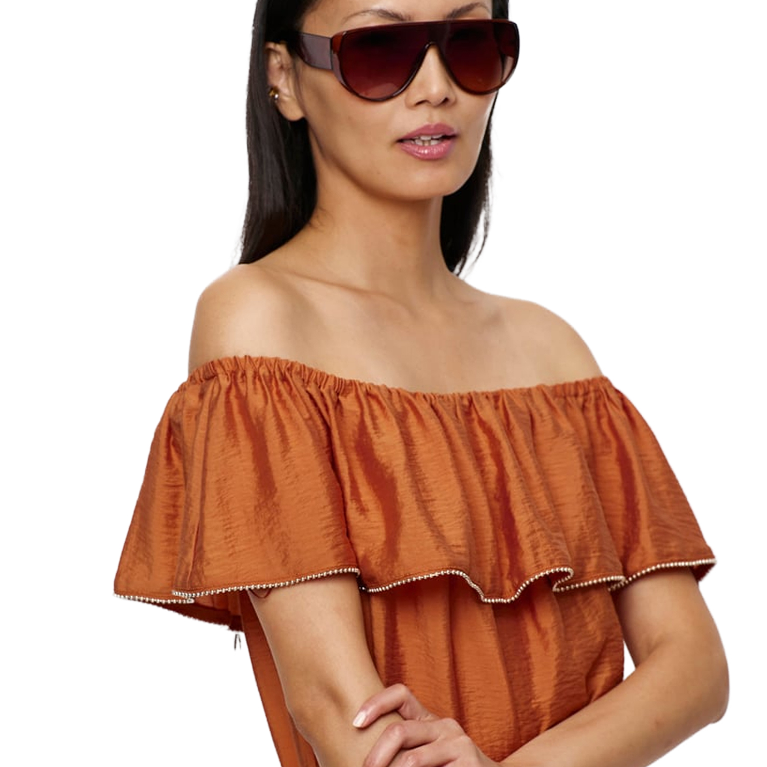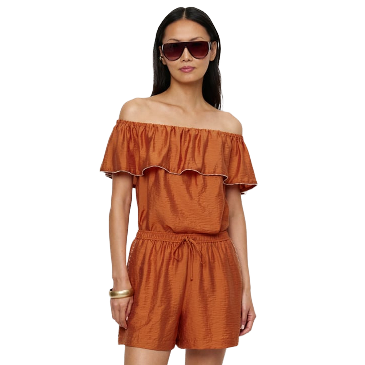 Top van het merk Dante6. Off-shoulder top van Dante6 met elastische halslijn dat zacht valt over de schouders, terwijl de volant met subtiele embellishment zorgt voor beweging. Materiaal: 84% Tencel, 16% polyamide