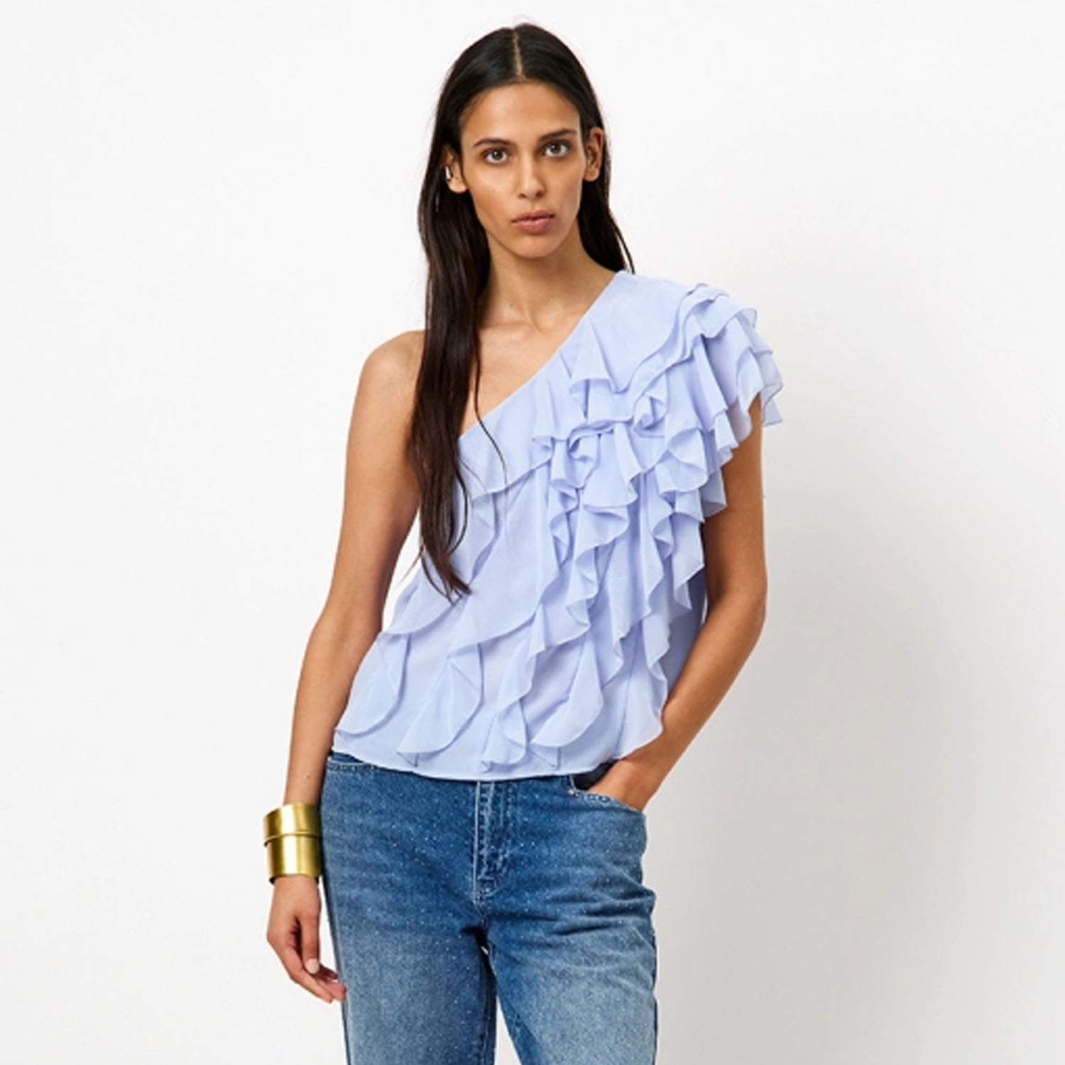Top van het merk Dante6. Top van Dante6 met asymmetrische pasvorm en fijne ruches. Materiaal: 100% Gerecycled Polyester