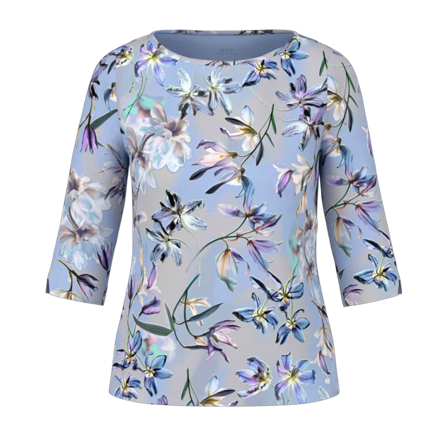 T-shirt van het merk Marc Cain Collections. T-shirt van Marc Cain Collections met all-over print en ronde hals. Materiaal: 94% katoen, 6% Elastaan