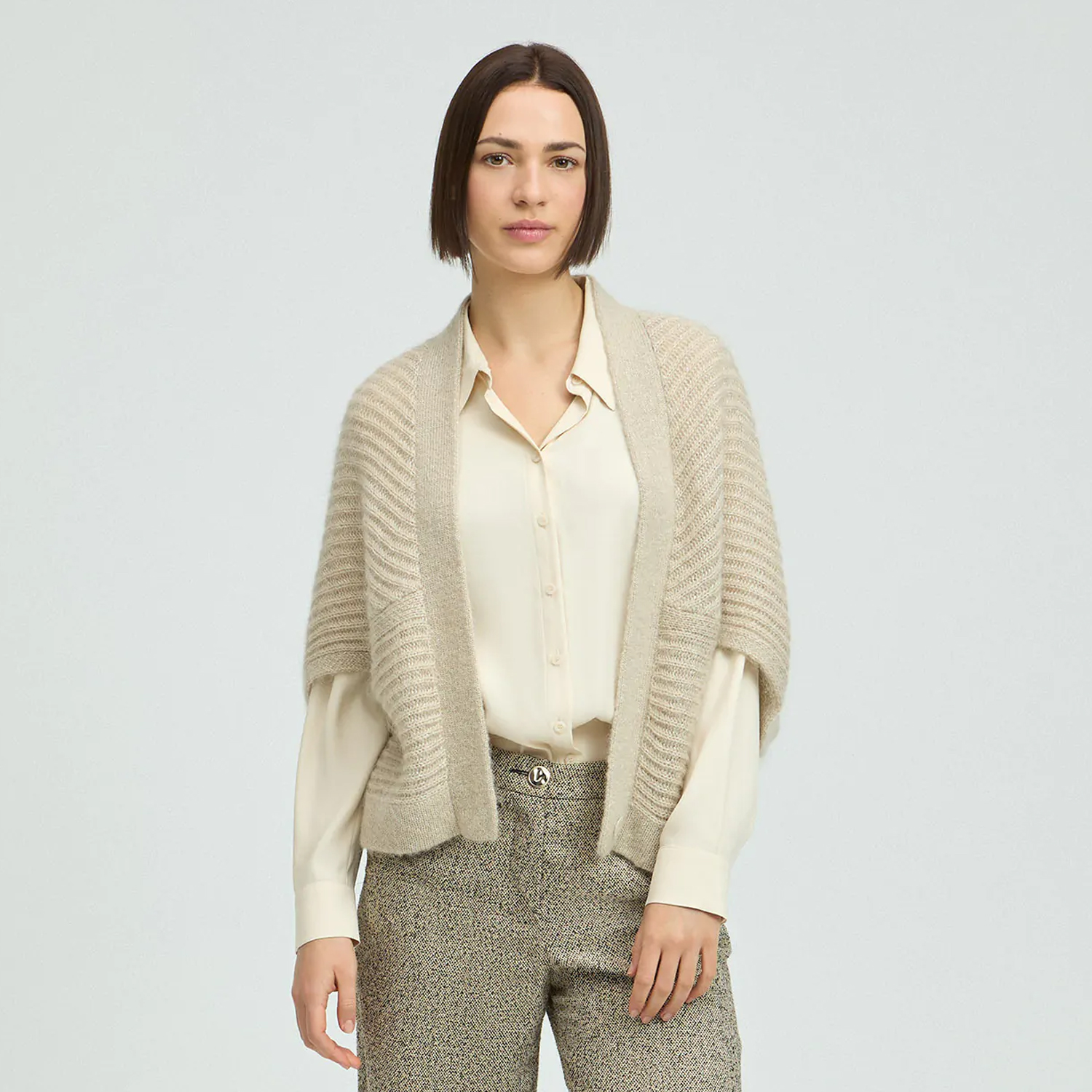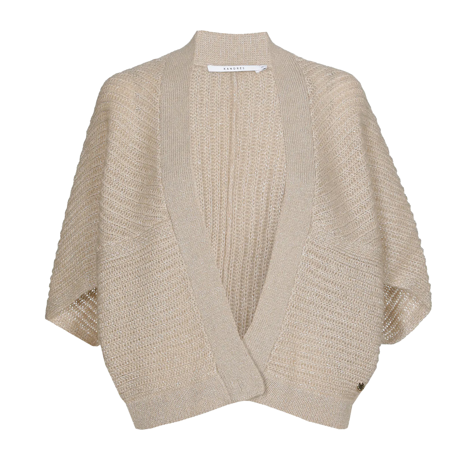 Losgebreide gilet met lurex van het merk Xandres, model Alaine. Materiaal: 34% polyamide, 25% mohair, 25% wol, 10% polyester, 6% Metaal